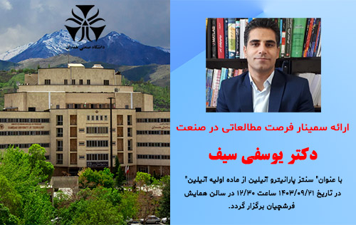 با عنوان" سنتز پارانیترو آنیلین از ماده اولیه آنیلین" در تاریخ 1403/09/21 ساعت 12/30 در سالن همایش فرشچیان برگزار گردد.