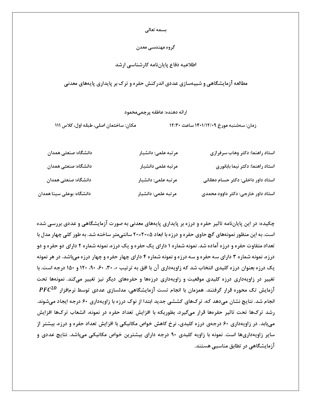اطلاعیه دفاع دانشجوی کارشناسی ارشد- عاطفه پرچمی