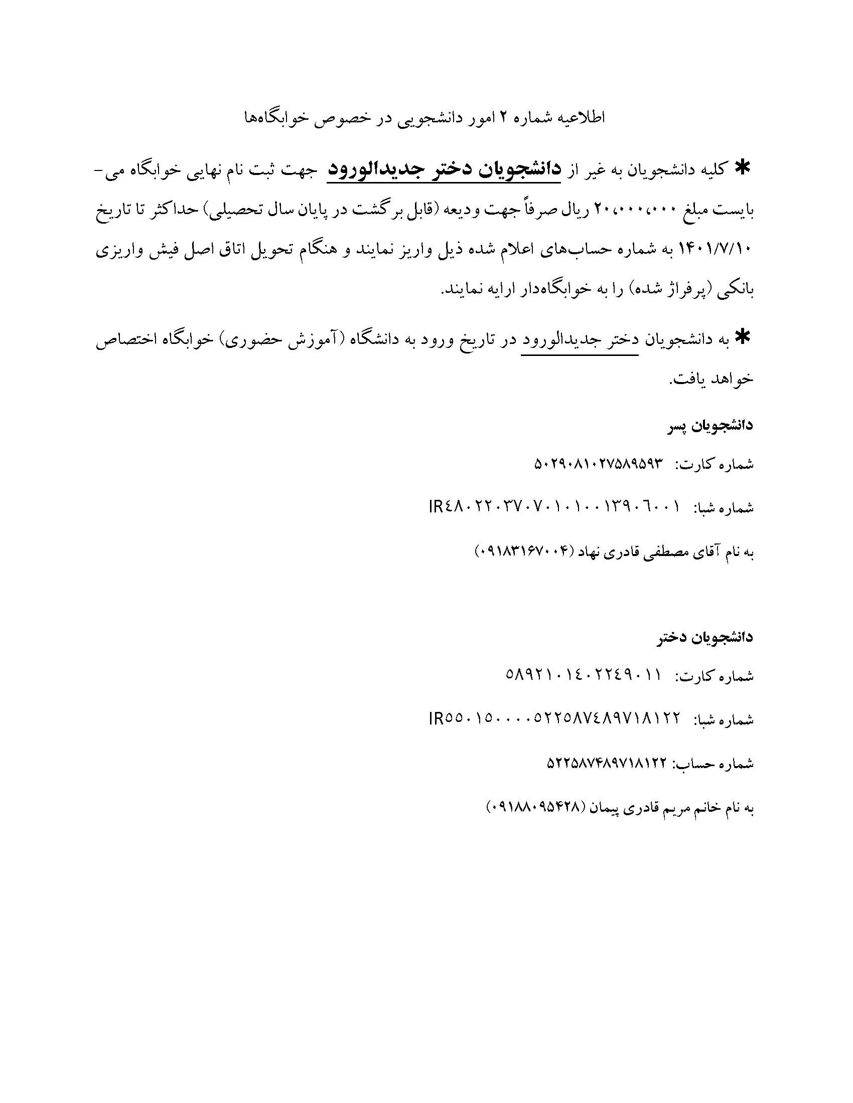 اطلاعیه شماره 2 امور دانشجویی در خصوص خوابگاه ها
