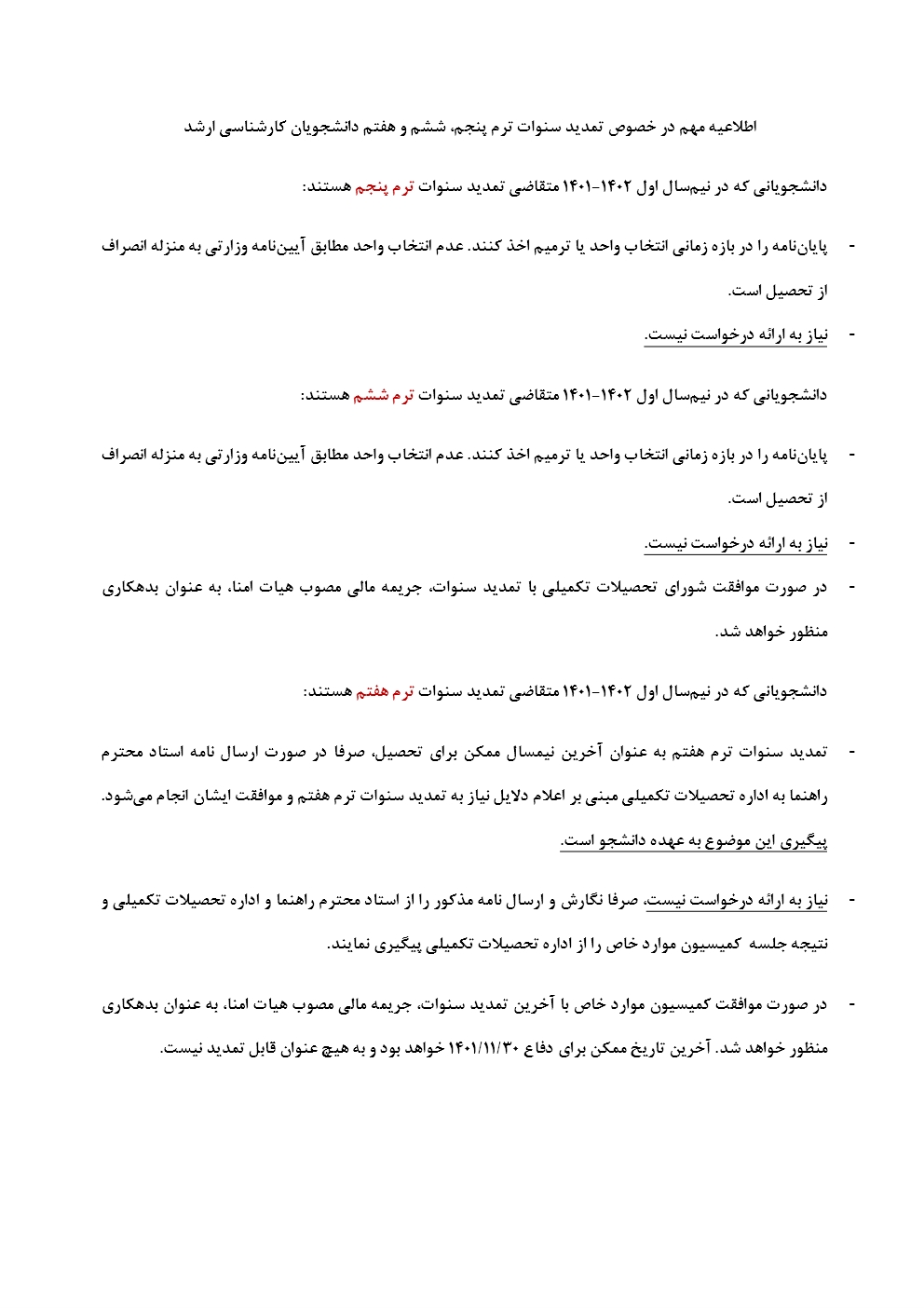 اطلاعیه مهم در خصوص تمدید سنوات دانشجویان کارشناسی ارشد ترم پنجم، ششم و هفتم