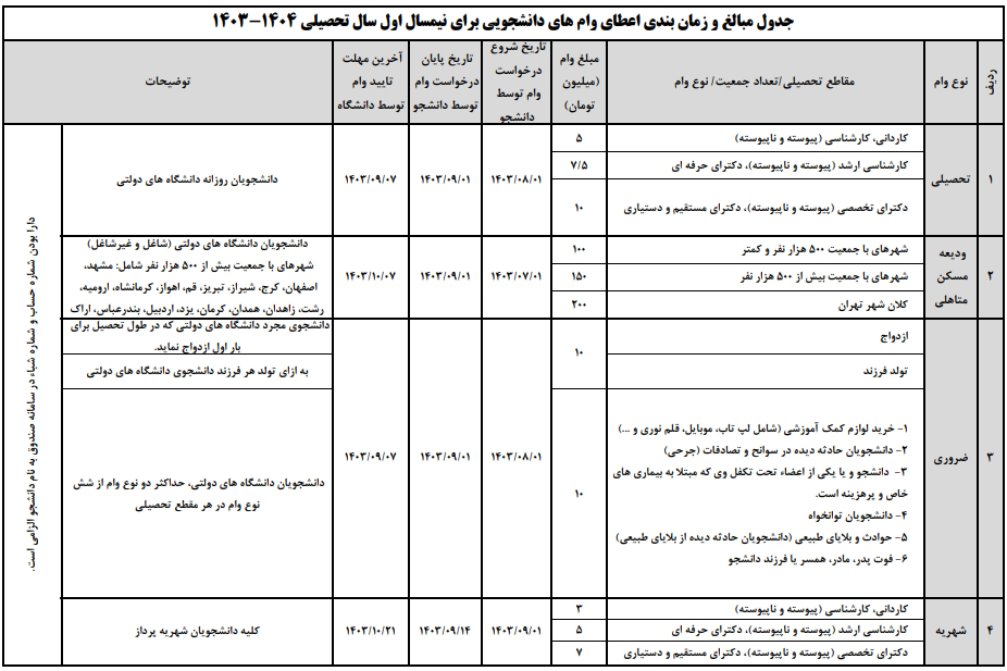 اطلاعیه وام های تحصیلی ، ضروری، شهریه و مسکن متاهلی