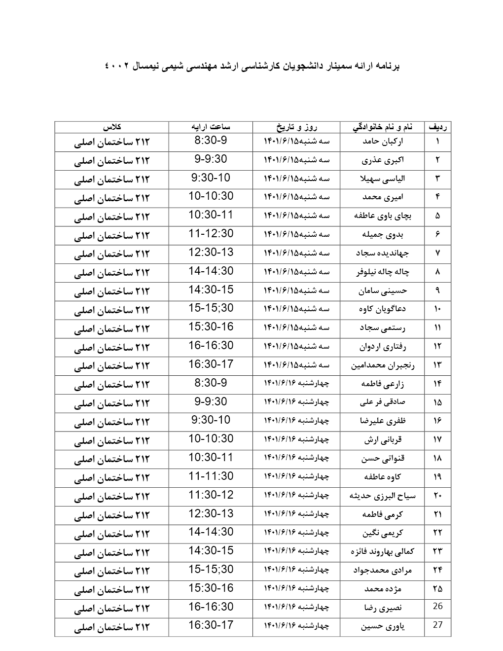 برنامه ارائه سمینار دانشجویان کارشناسی ارشد مهندسی شیمی