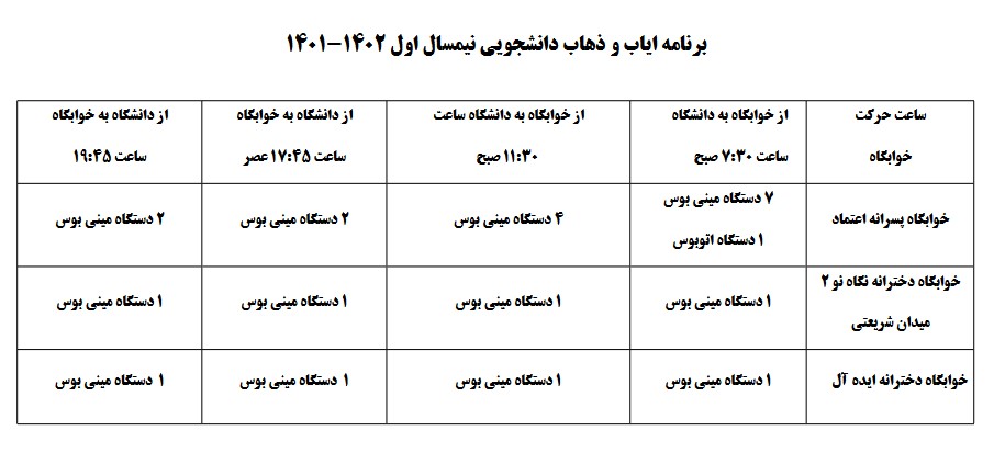برنامه ایاب و ذهاب دانشجویی نیمسال اول 1402-1401
