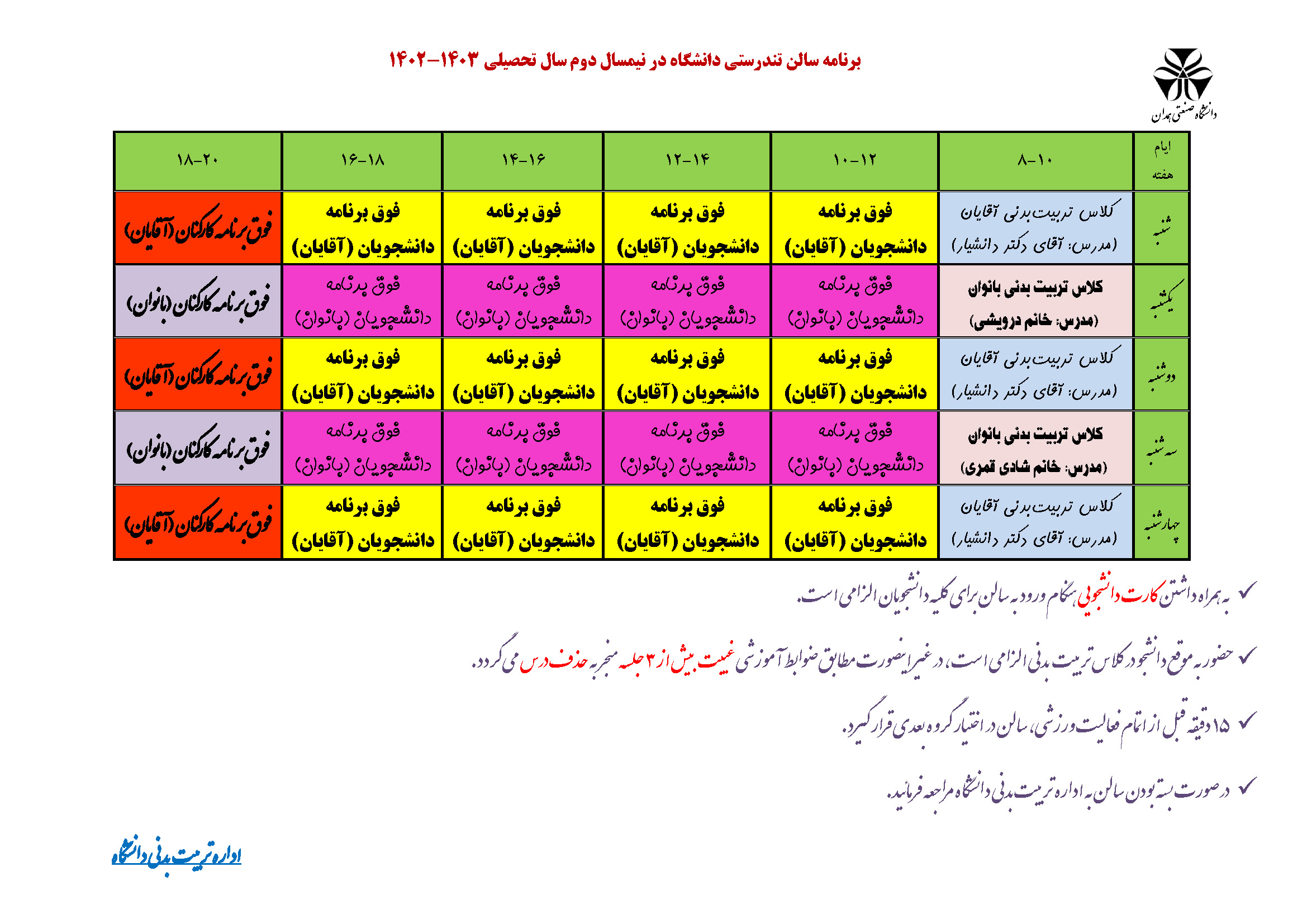 برنامه سالن تندرستی- نیمسال دوم 402-403