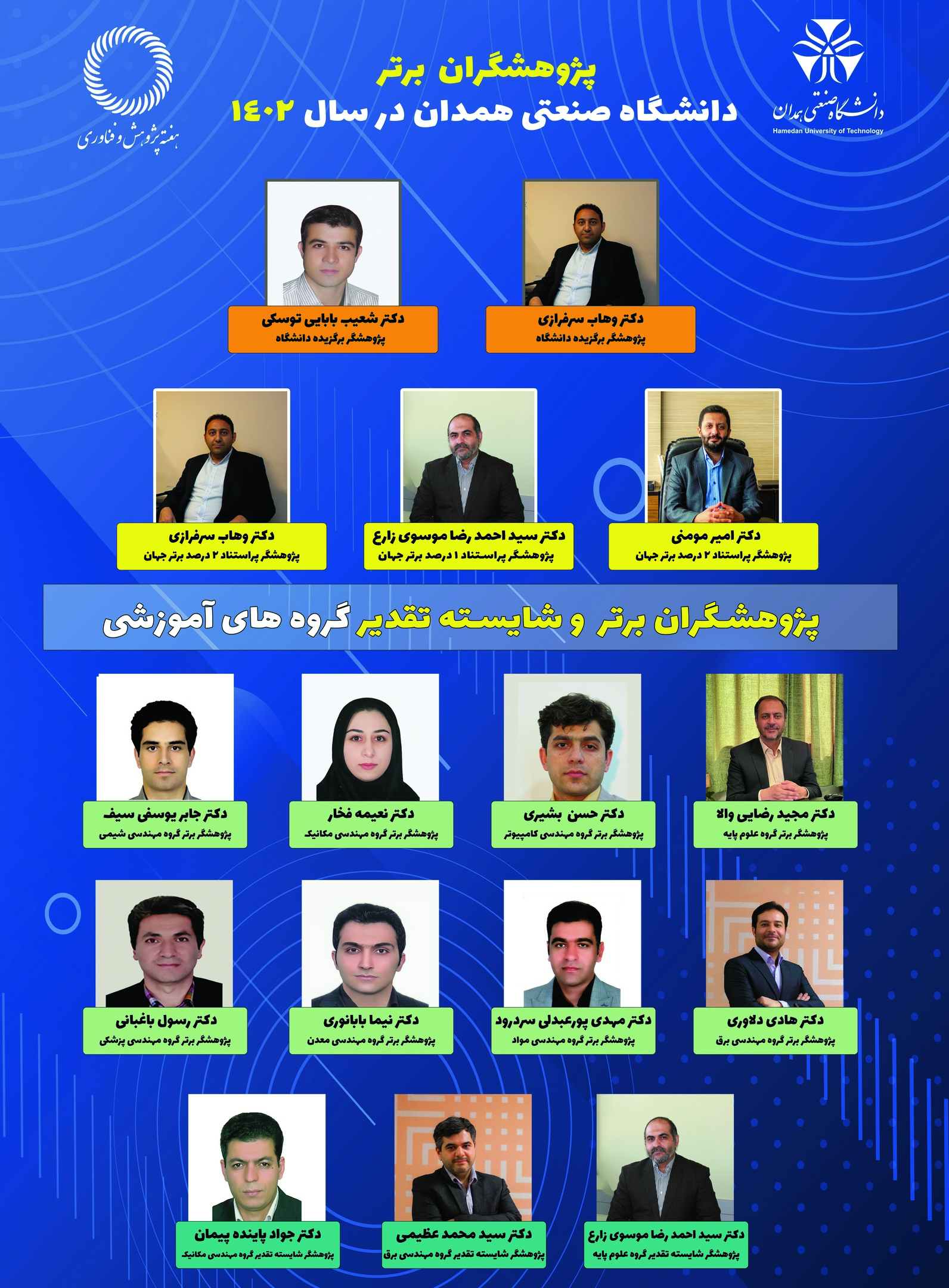 در این مراسم پژوهشگران برتر دانشگاه صنعتی همدان معرفی و تقدیر شدند؛ در این معرفی وهاب سرفرازی، عضو هیات علمی گروه مهندسی معدن و شعیب بابایی توسکی، عضو هیات علمی گروه مهندسی برق به عنوان پژوهشگران برتر استانی معرفی و تقدیر شدند.