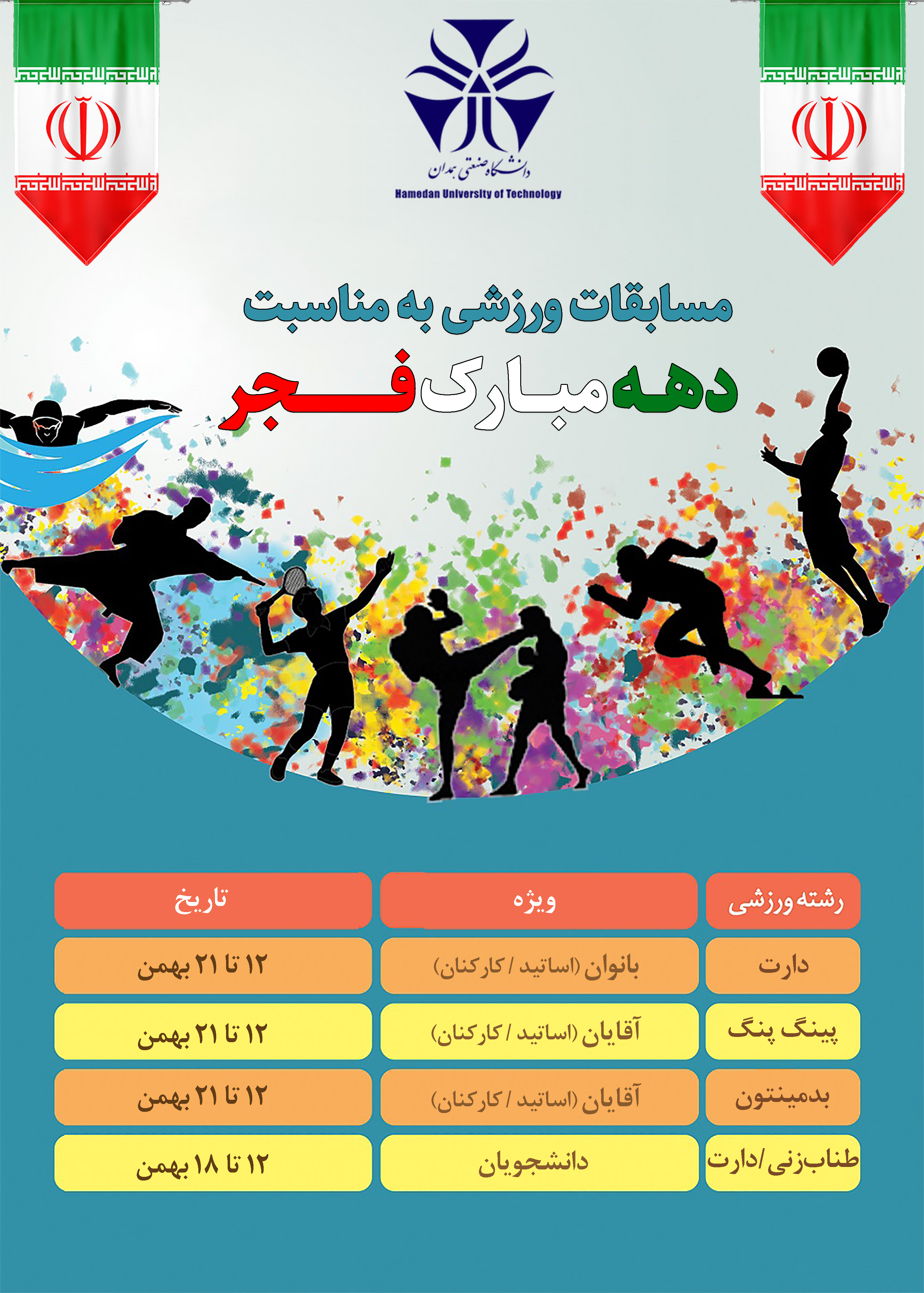 به اطلاع می رساند اداره تربیت بدنی دانشگاه در نظر دارد به مناسبت گرمیداشت دهه مبارک فجر مسابقات ورزشی در رشته های دارت و طناب زنی را در بخش خواهران و برادران به صورت مجازی برگزار نماید. ضمن مطالعه دقیق آیین نامه مسابقات با حضور حداکثری در مسابقات مذکور شرکت نمایید.