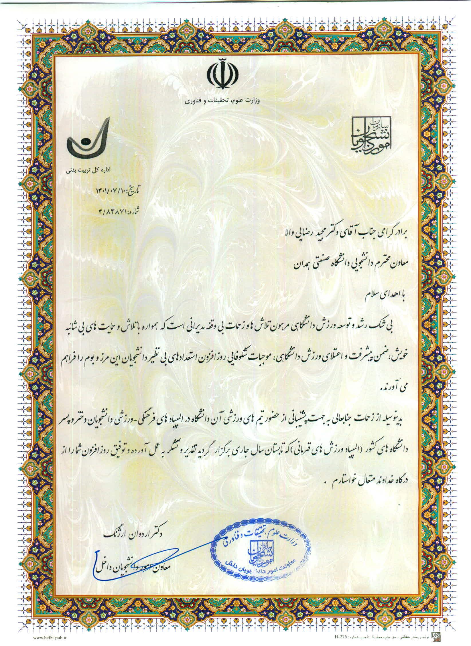 تشکر و قدردانی سازمان امور دانشجویان از دکتر مجید رضایی والا، معاون دانشجویی و فرهنگی دانشگاه صنعتی همدان