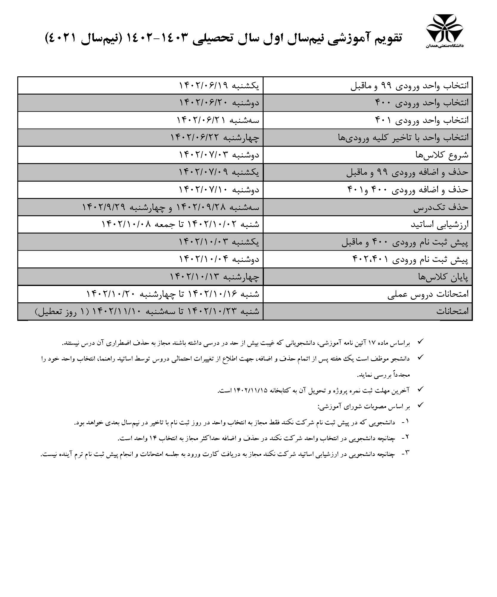 تقويم آموزشي نيمسال اول سال تحصيلي 1403-1402 (نیمسال 4021)