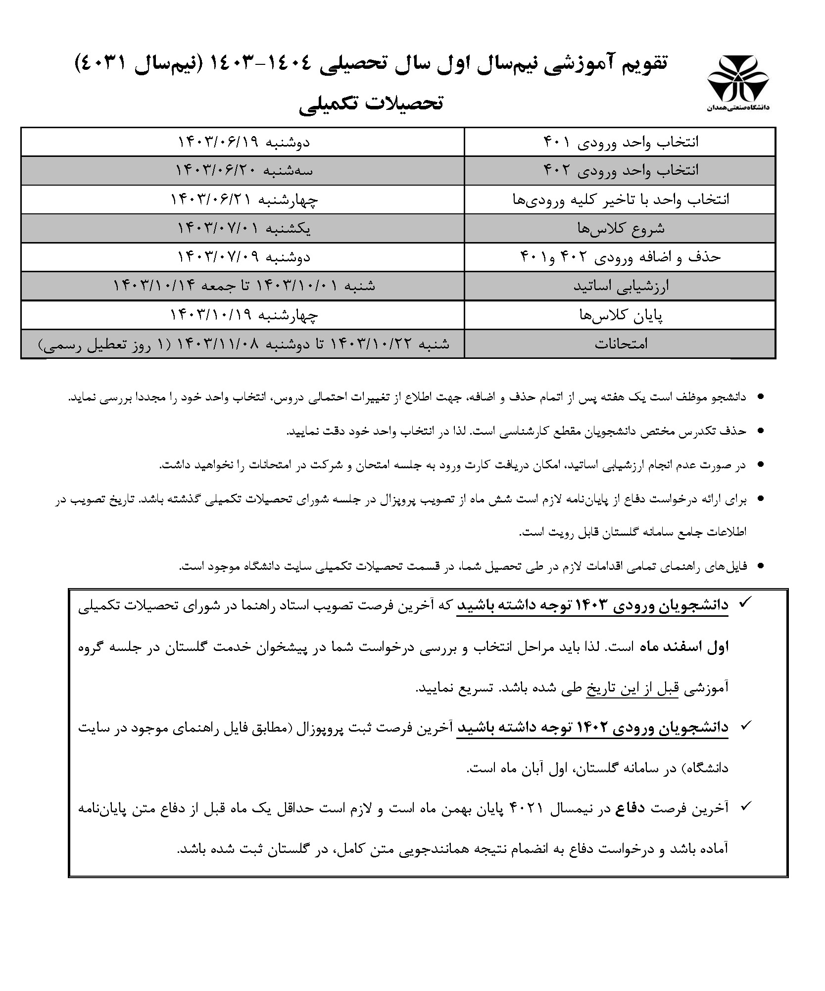 تقویم آموزشی تحصیلات تکمیلی