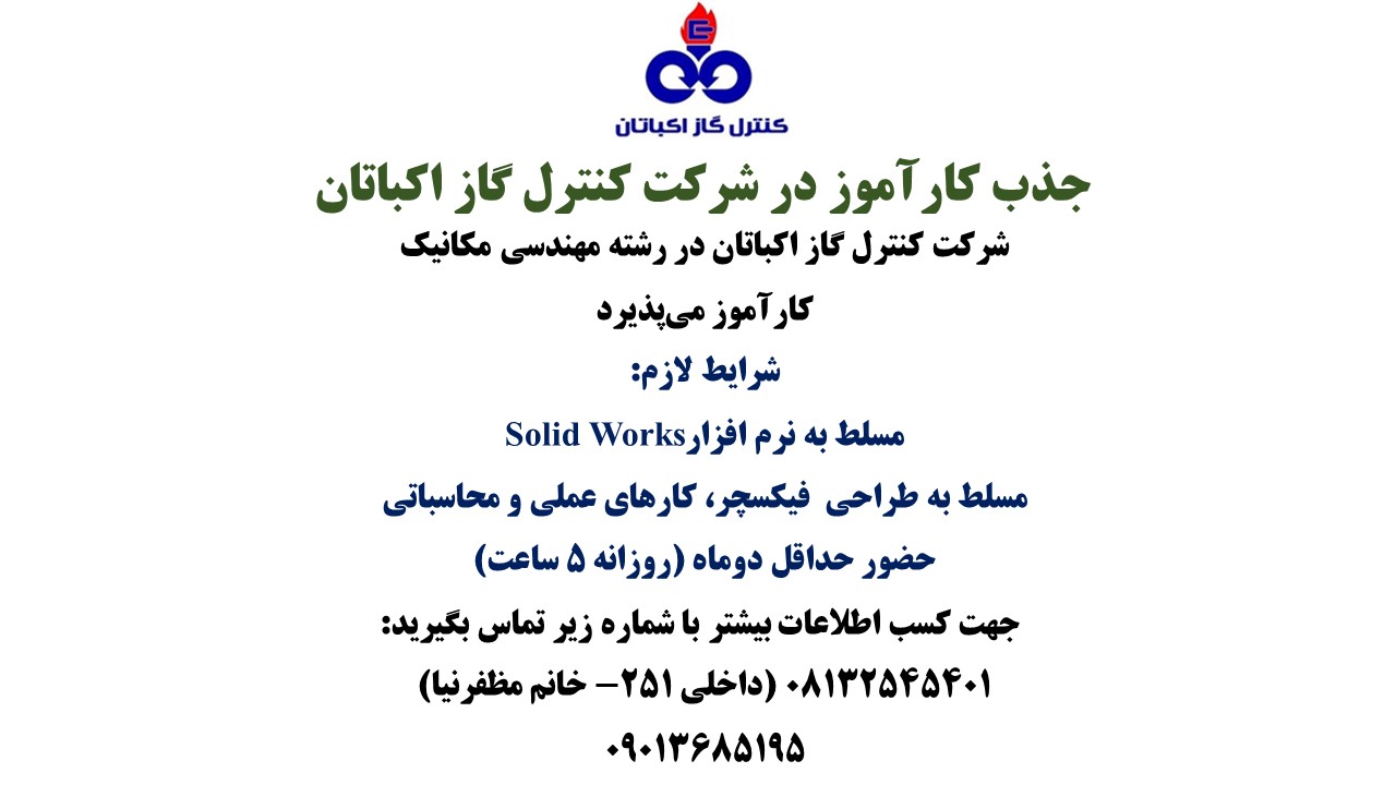 بدینوسیله به اطلاع میرساند با توجه به همکاری شرکت کنترل گاز اکباتان و دانشگاه صنعتی همدان، این شرکت در زمینه رشته مهندسی مکانیک کارآموز میپذیرد.
