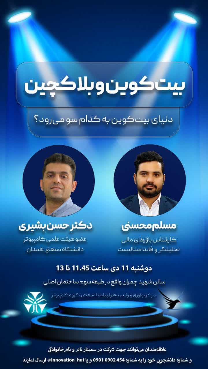 سمینار «بیتکوین و بلاکچین» روز دوشنبه مورخ ۱۱ دی ساعت ۱۱.۴۵ تا ۱۳ در سالن شهید چمران برگزار می شود.