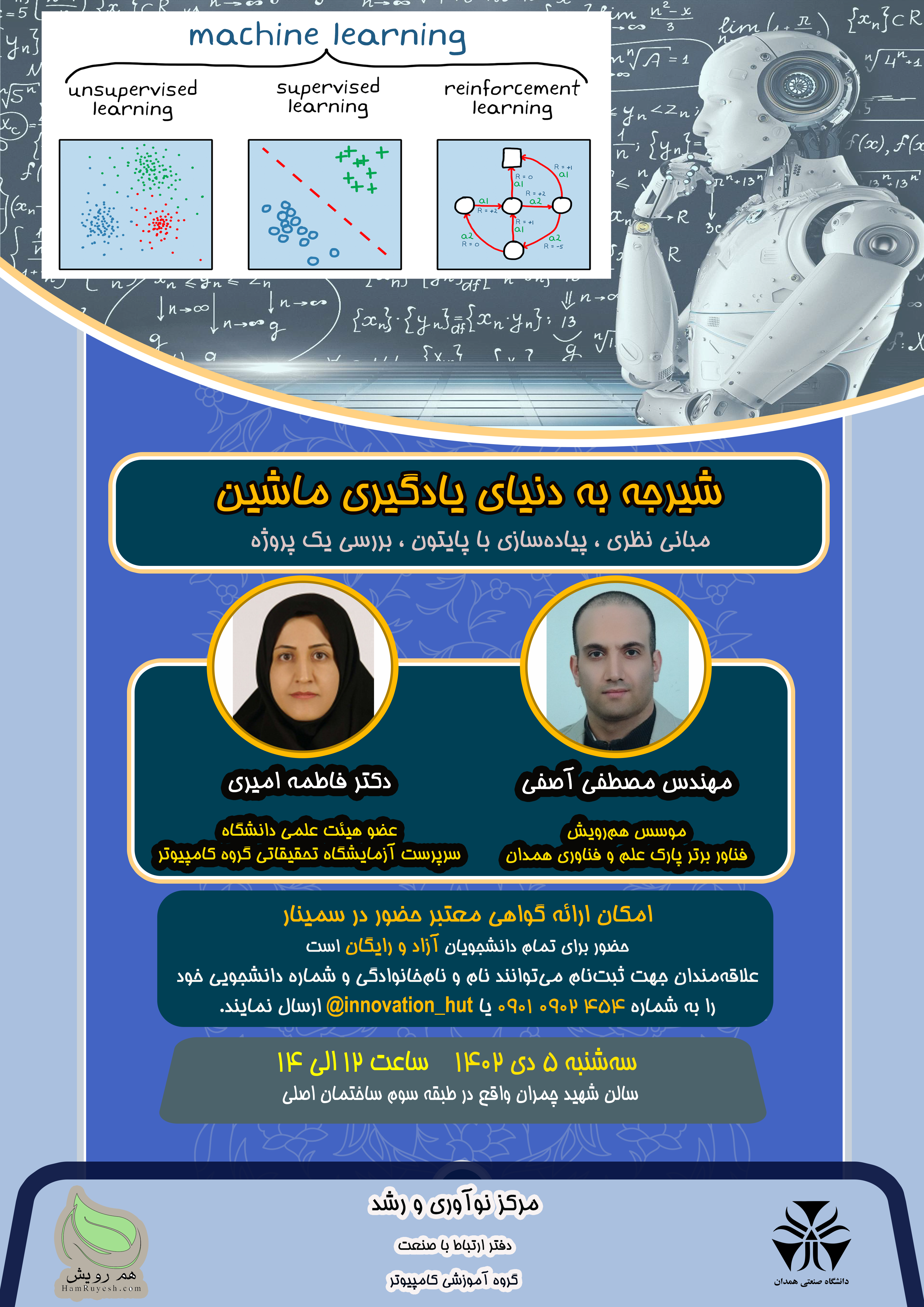 سمینار " شیرجه به دنیای یادگیری ماشین" با همکاری مرکز رشد و نوآوری و گروه کامپیوتر در تاریخ سهشنبه 5 دی ساعت 12 الی 14 در سالن شهید چمران برگزار خواهد شد. محوریت سمینار درباره معرفی حوزه machine learning و پایتون می باشد و با حضور و سخنرانی دکتر امیری و مهندس آصفی همچنین حضور چندی از اساتید محترم دانشگاه برگزار می شود. شرکت در این سمینار کاملا رایگان می باشد و ثبت نام برای عموم دانشجویان گرامی آزاد است. به دانشجویان شرکت کننده گواهی معتبر حضور در سمینار توسط مرکز آموزشهای آزاد دانشگاه در صورت ثبتنام داده خواهد شد.اپ