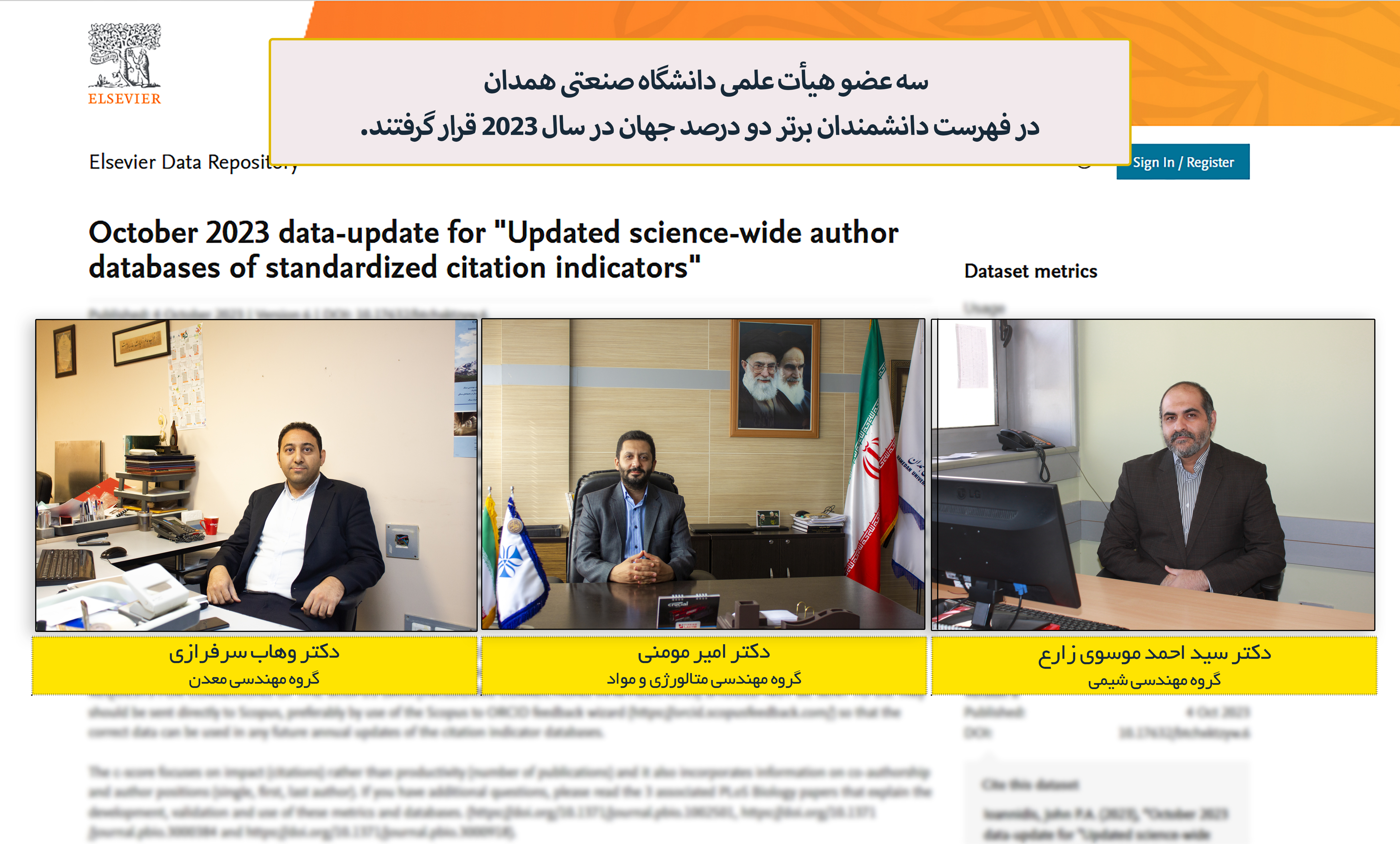 به گزارش روابط عمومی دانشگاه؛ بر اساس گزارش مورخ 4 اکتبر 2023 موسسه علمی و انتشاراتی Elsevier که بر مبنای داده های پایگاه اسکوپوس تهیه گردیده است، سه عضو هیات علمی از دانشگاه صنعتی همدان، دکتر امیر مومنی، دکتر سید احمد رضا موسوی زارع و دکتر وهاب سرفرازی در فهرست دانشمندان دو درصد برتر دنيا در سال 2023 قرار گرفتند.