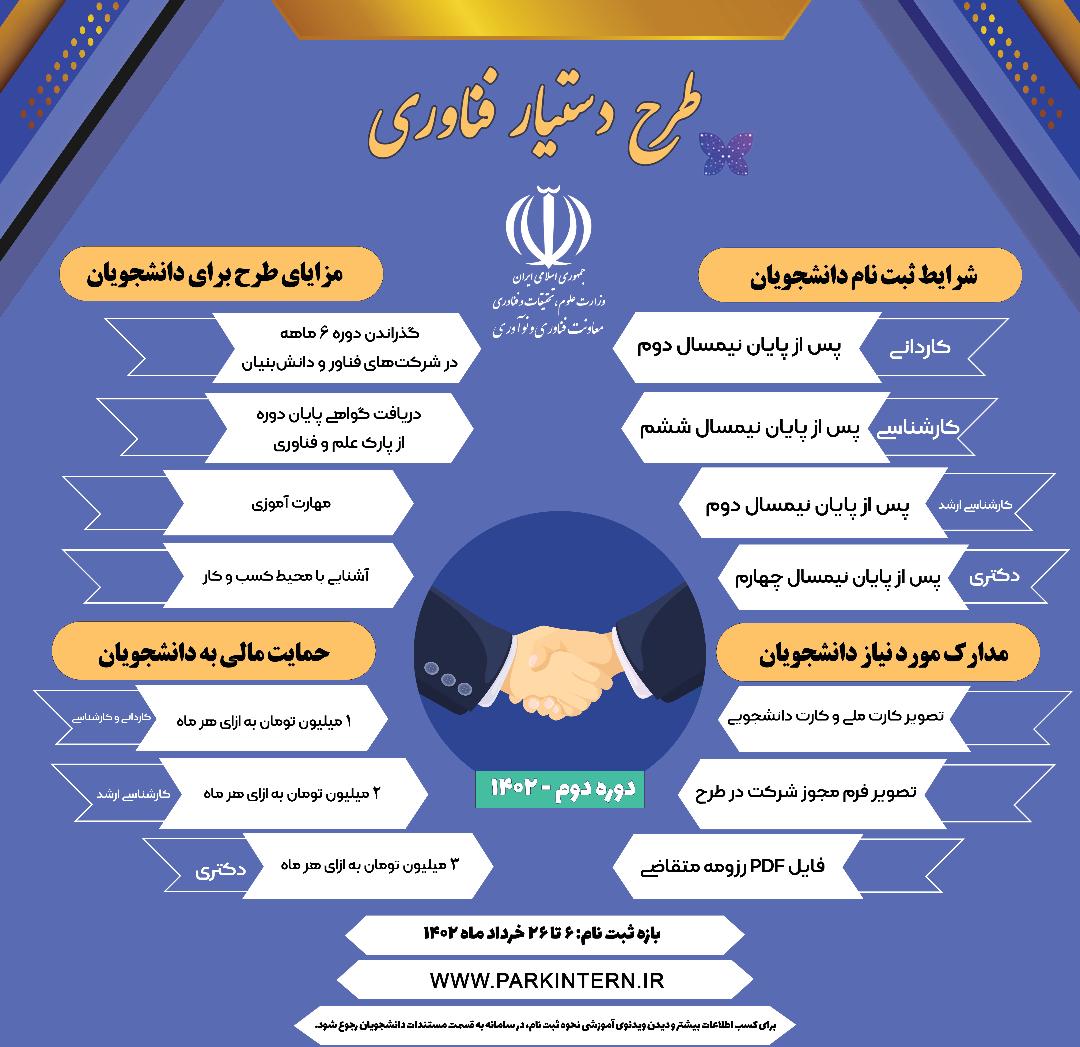 ثبت‌نام متقاضیان دستیاری در بازه 1402/3/6 تا 1402/4/15در سامانه دستیار فناوری به آدرس (WWW.Parkintern.ir) انجام می‌شود.