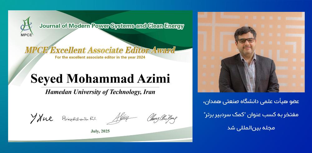دکتر سید محمد عظیمی، عضو هیأت علمی گروه مهندسی برق دانشگاه صنعتی همدان، در مجله «Journal  of Modern Power Systems and Clean Energy»  به عنوان «کمک سردبیر برتر» انتخاب شد.