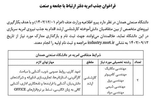 ◀️ دانشگاه صنعتی همدان در نظر دارد پیرو اطلاعیه وزارت عتف (اعزام 1403/12/01) و با هدف بکارگیری نیروهای متخصص از بین متقاضیان دانش آموخته کارشناسی ارشد اقدام به جذب نیروی امریه سربازی در این دانشگاه نماید.