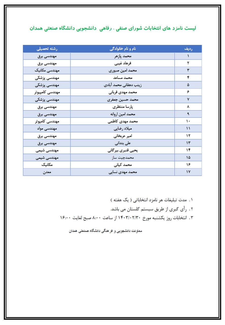 لیست نامزد های انتخابات شورای صنفی – رفاهی دانشجویی دانشگاه صنعتی همدان