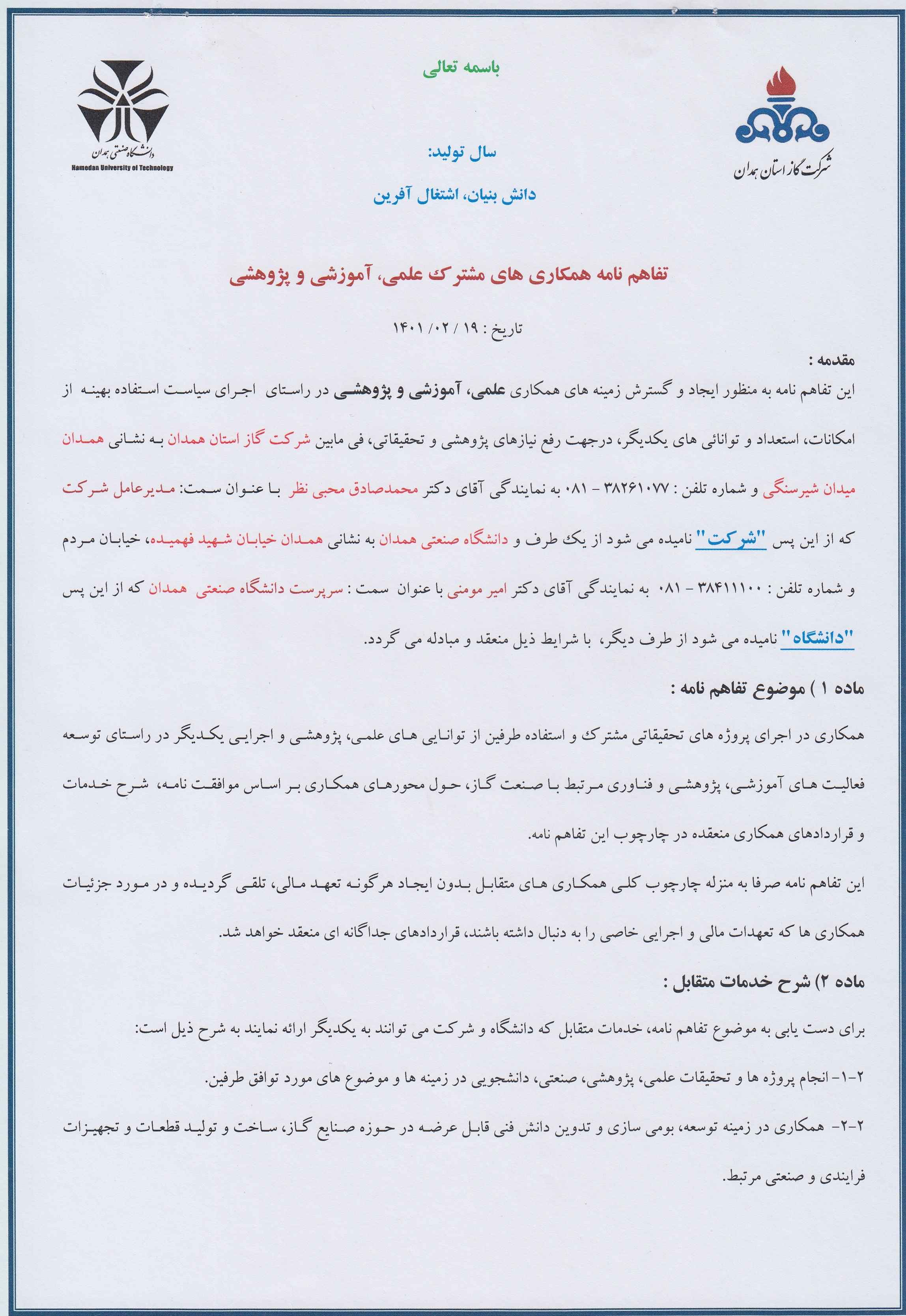 متن تفاهم نامه دانشگاه صنعتی همدان با شرکت گاز