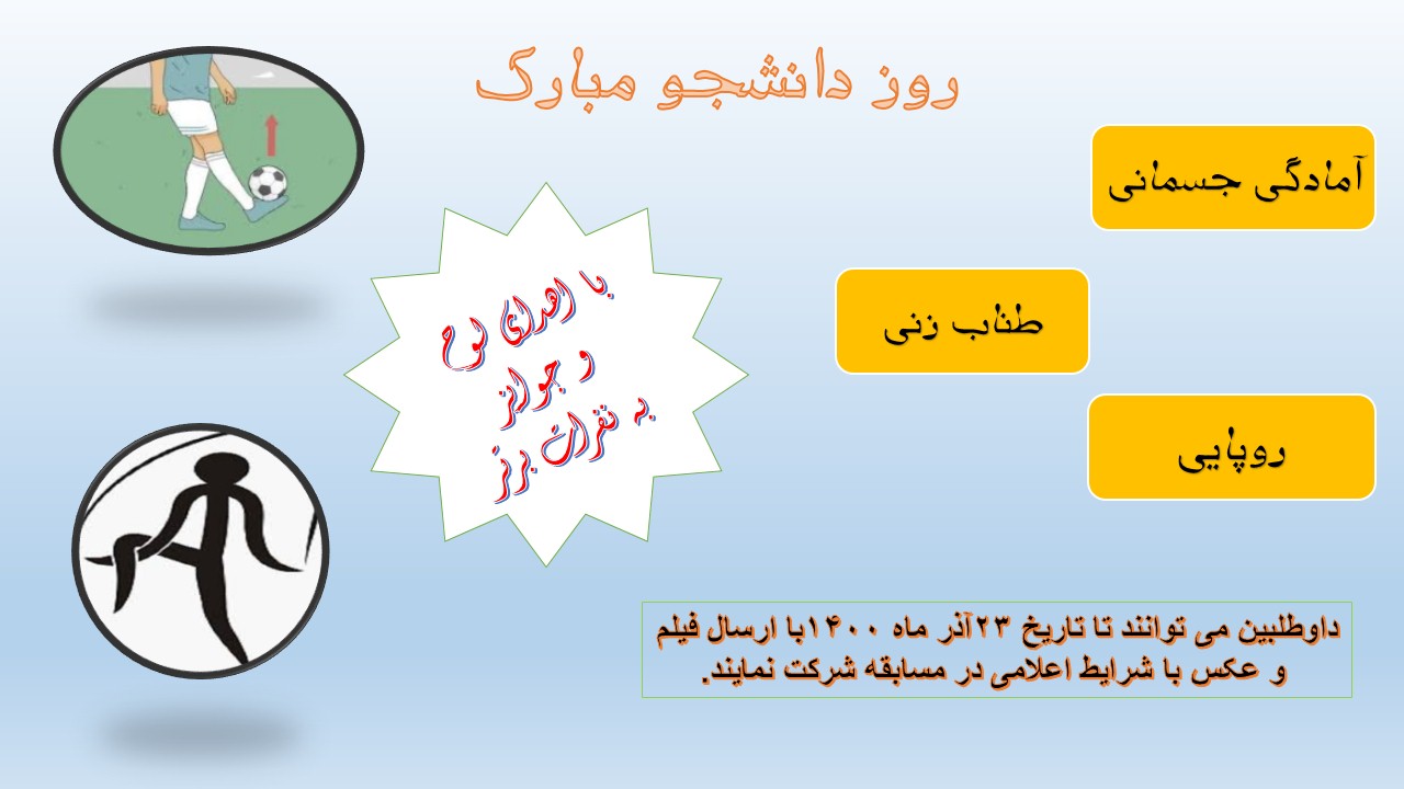 اداره تربیت بدنی دانشگاه در نظر دارد به مناسبت 16 آذر ماه روز دانشجو اقدام به برگزاری مسابقات زیر نماید. لذا از دانشجویان محترم دعوت می آید در صورت تمایل در رشته های زیر شرکت نمایند. بدیهی می باشد به نفرات برتر این مسابقات لوح و جوایز ارزنده ای اهداء می گردد.