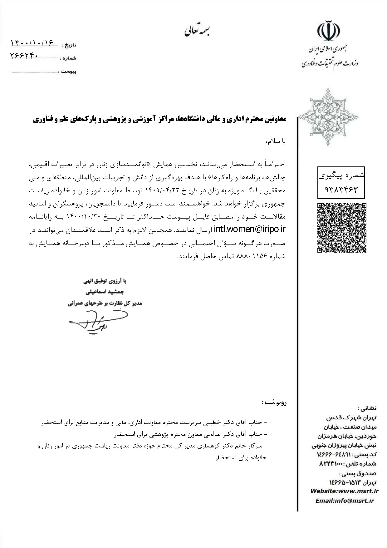 نخستین همایش«توانمندسازی زنان در برابر تغییرات اقلیمی، چالش ها، برنامه ها و راهکارها» با هدف بهره گیری از دانش و تجربیات بین المللی، منطقه ای و ملی محققین با نگاه ویژه به زنان در تاریخ ۱۴۰۱/۰۴/۲۳توسط معاونت امور زنان و خانواده ریاست جمهوری برگزار خواهد شد. دانشجویان، پژوهشگران و اساتید مقالات خود را مطابق فایل پیوست حداکثر تا تاریخ ۱۴۰۰/۱۰/۳۰به رایانامه intl.womeniripo.ir ارسال نمایند. همچنین لازم به ذکر است، علاقمندان می توانند در صورت هرگونه سؤال احتمالی در خصوص همایش مذکور با دبیرخانه همایش به شماره ۸۸۸۰۱۱۵۶تماس حاصل فرمایند.