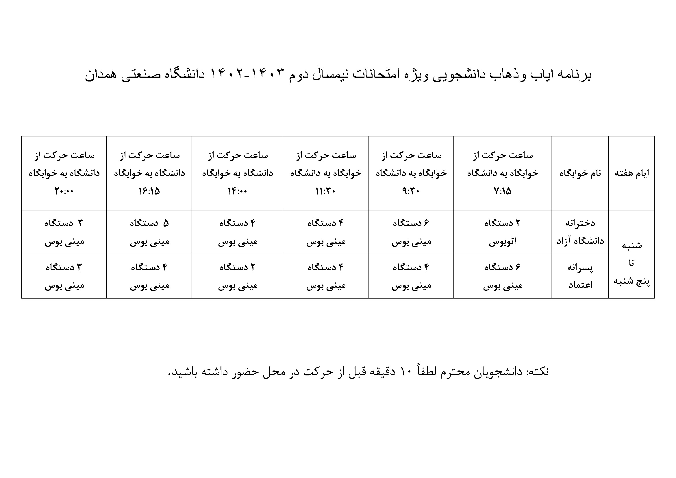 ﺑﺮﻧﺎﻣﻪ ﺍﯾﺎﺏ ﻭﺫﻫﺎﺏ ﺩﺍﻧﺸﺠﻮﯾﯽ ﻭﯾﮋﻩ ﺍﻣﺘﺤﺎﻧﺎﺕ ﻧﯿﻤﺴﺎﻝ ﺩﻭﻡ ۱۴۰۲-۱۴۰۳ ﺩﺍﻧﺸﮕﺎﻩ ﺻﻨﻌﺘﯽ ﻫﻤﺪﺍﻥ
