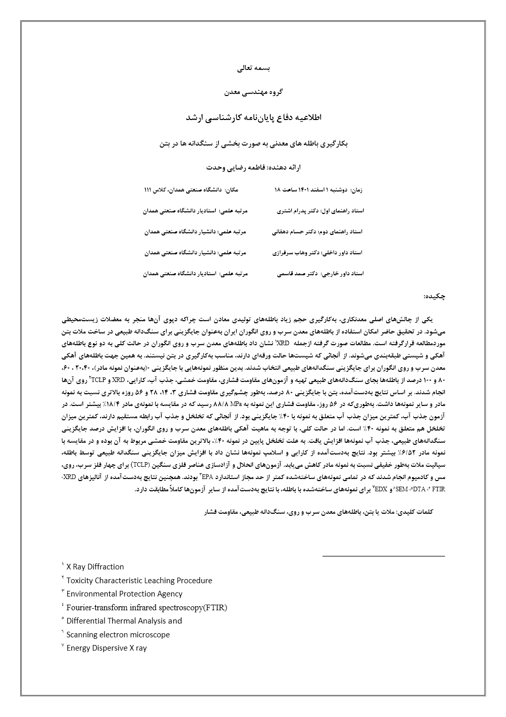 اطلاعیه دفاع دانشجوی کارشناسی ارشد - فاطمه رضایی وحدت