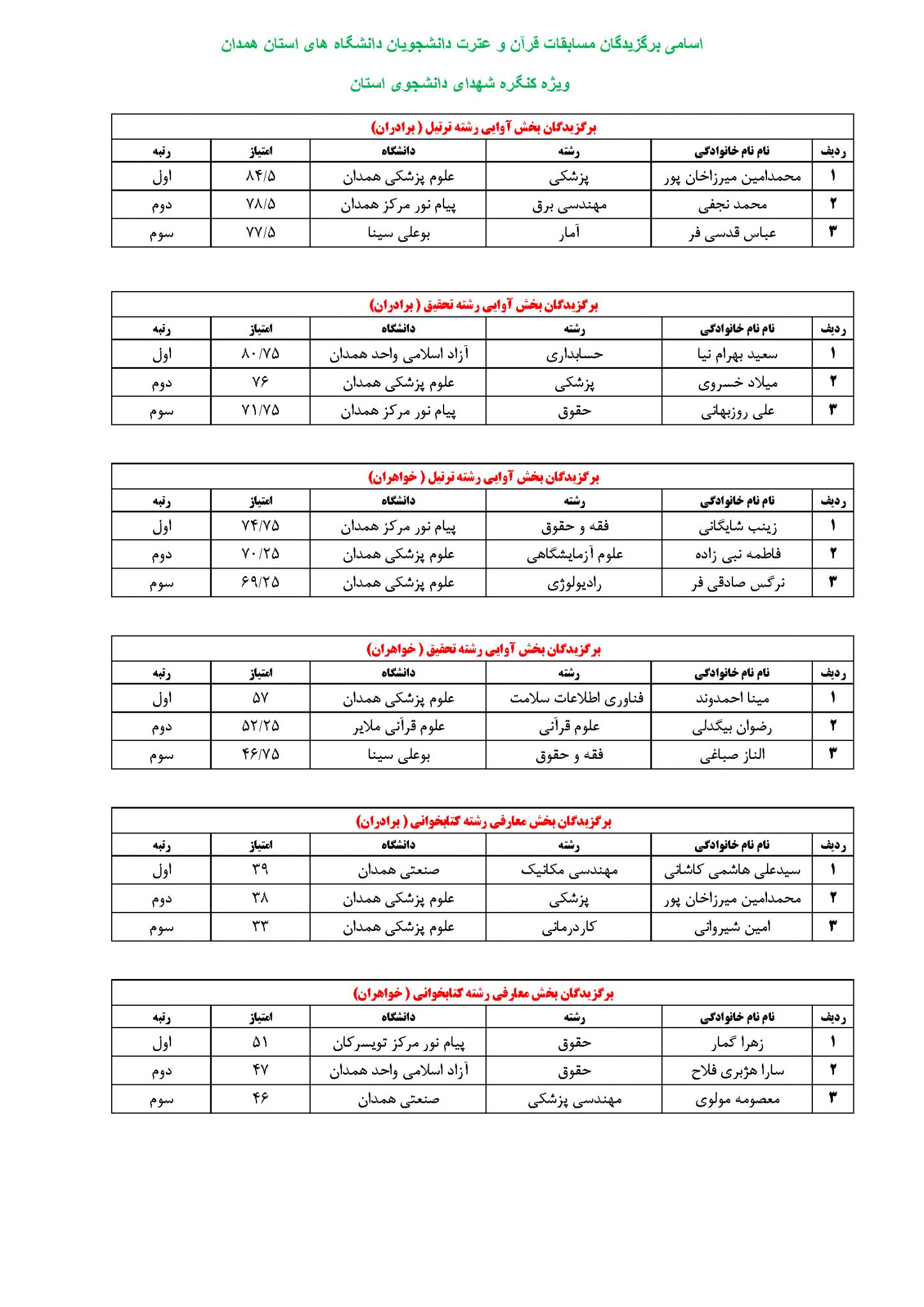 با سلام و تشکر از کلیه شرکت کنندگان گرامی در مسابقه قرآن و عترت دانشجویی دانشگاه های استان همدان (کنگره شهدای دانشجوی استان) و عرض تبریک به برگزیدگان برتر این مسابقه، اسامی برگزیدگان مسابقه در بخش های مختلف به شرح ذیل اعلام می گردد.