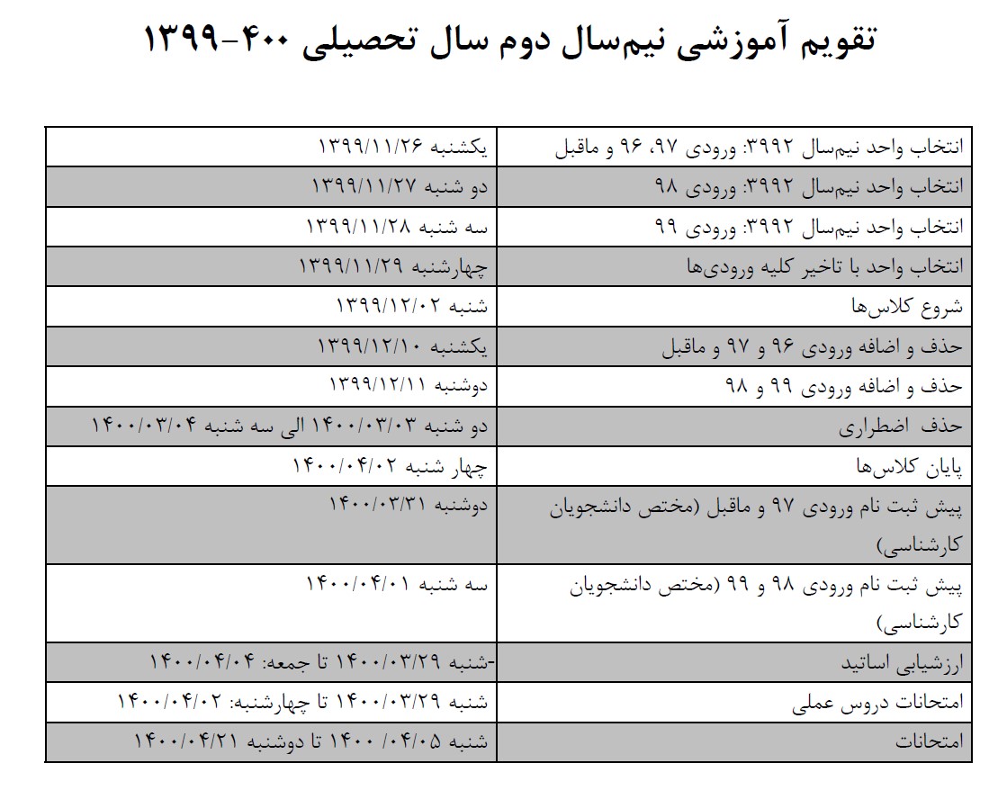 تقویم آموزشی و تاریخهای کلیدی آموزشی نیمسال ۳۹۹۲