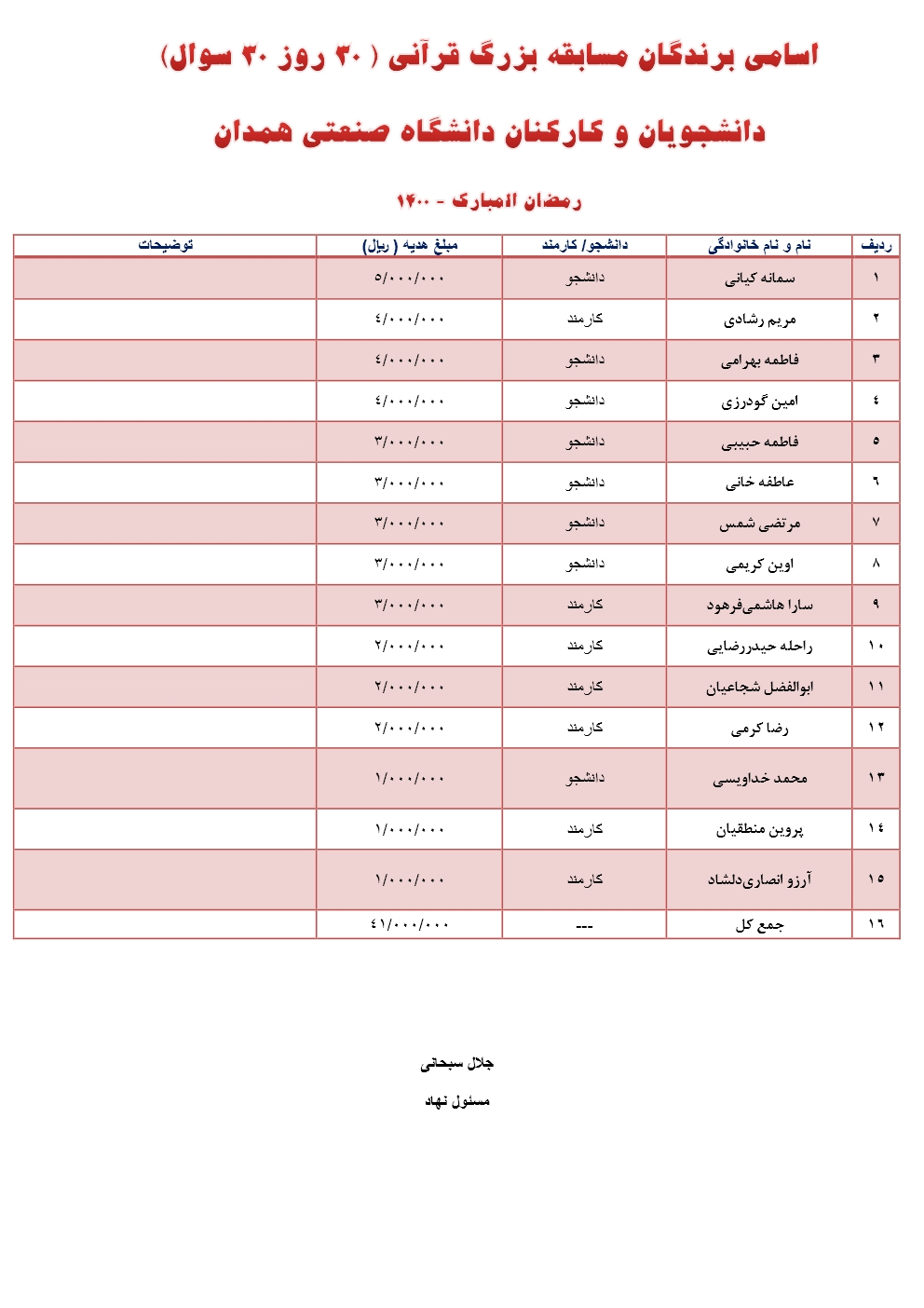 نتایج مسابقه بزرگ قرآنی ماه مبارک رمضان ( ۳۰ روز ۳۰ سوال) در بخش دانشجویان و کارکنان