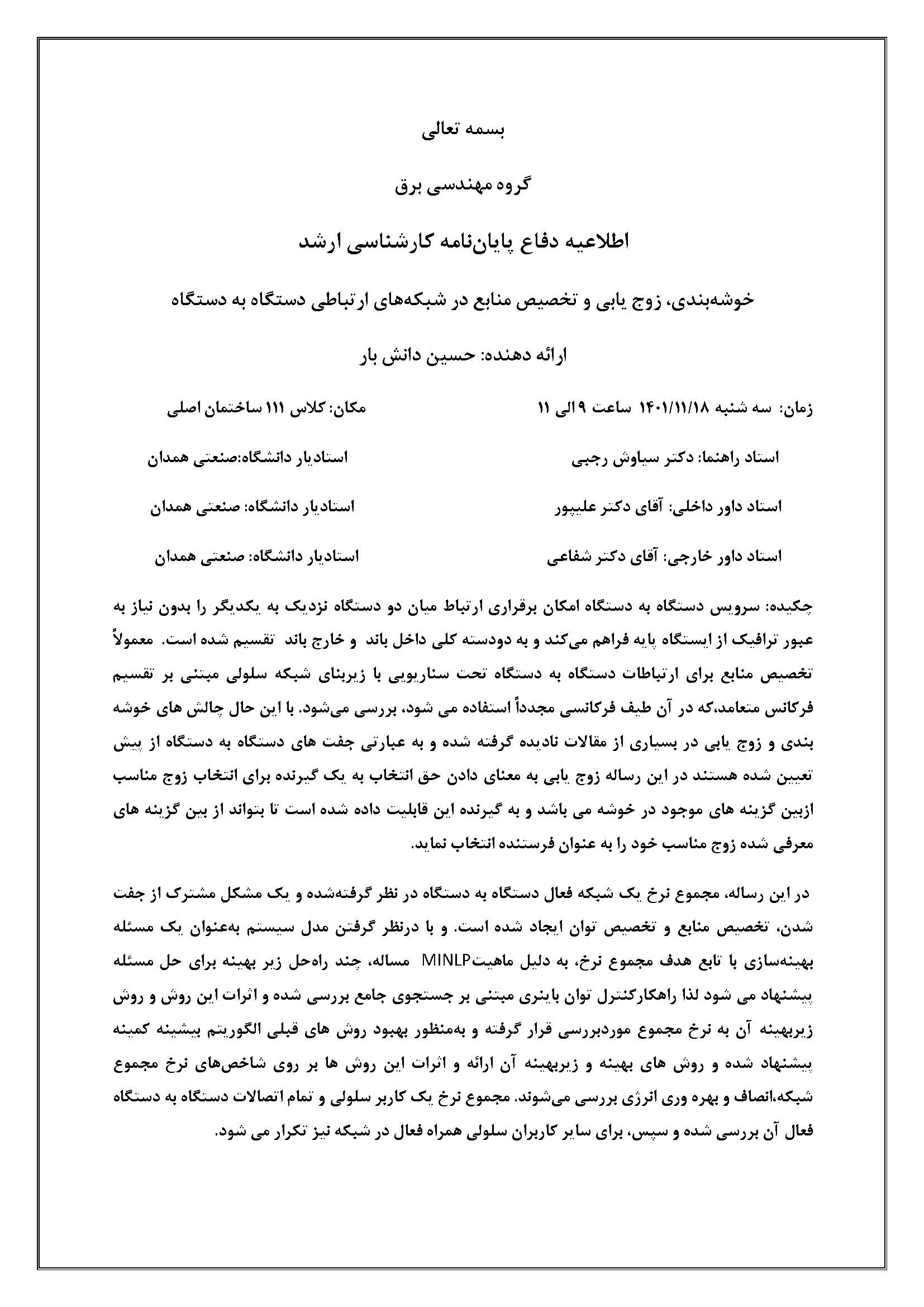 اطلاعیه دفاع دانشجوی کارشناسی ارشد - حسین دانشبار
