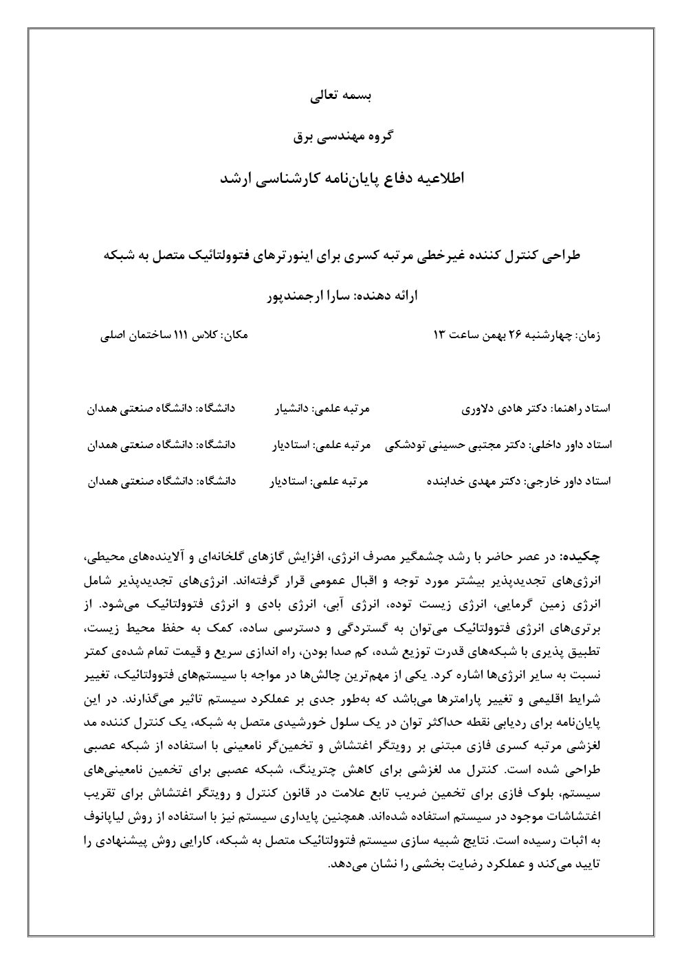 اطلاعیه دفاع دانشجوی کارشناسی ارشد - سارا ارجمندپور