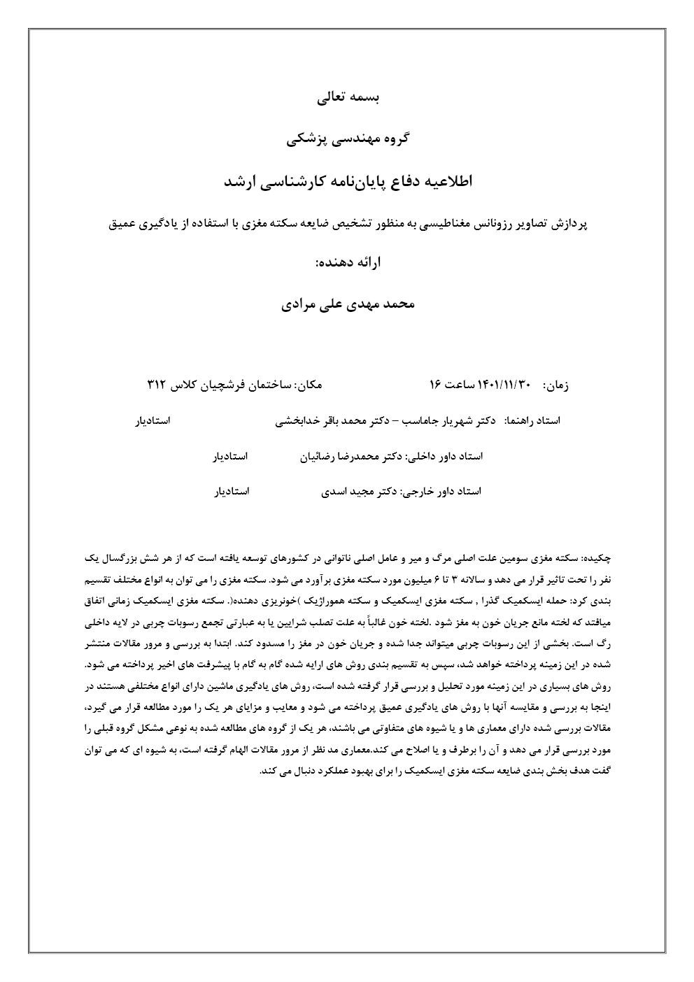 اطلاعیه دفاع دانشجوی کارشناسی ارشد - محمد مهدی علی مرادی