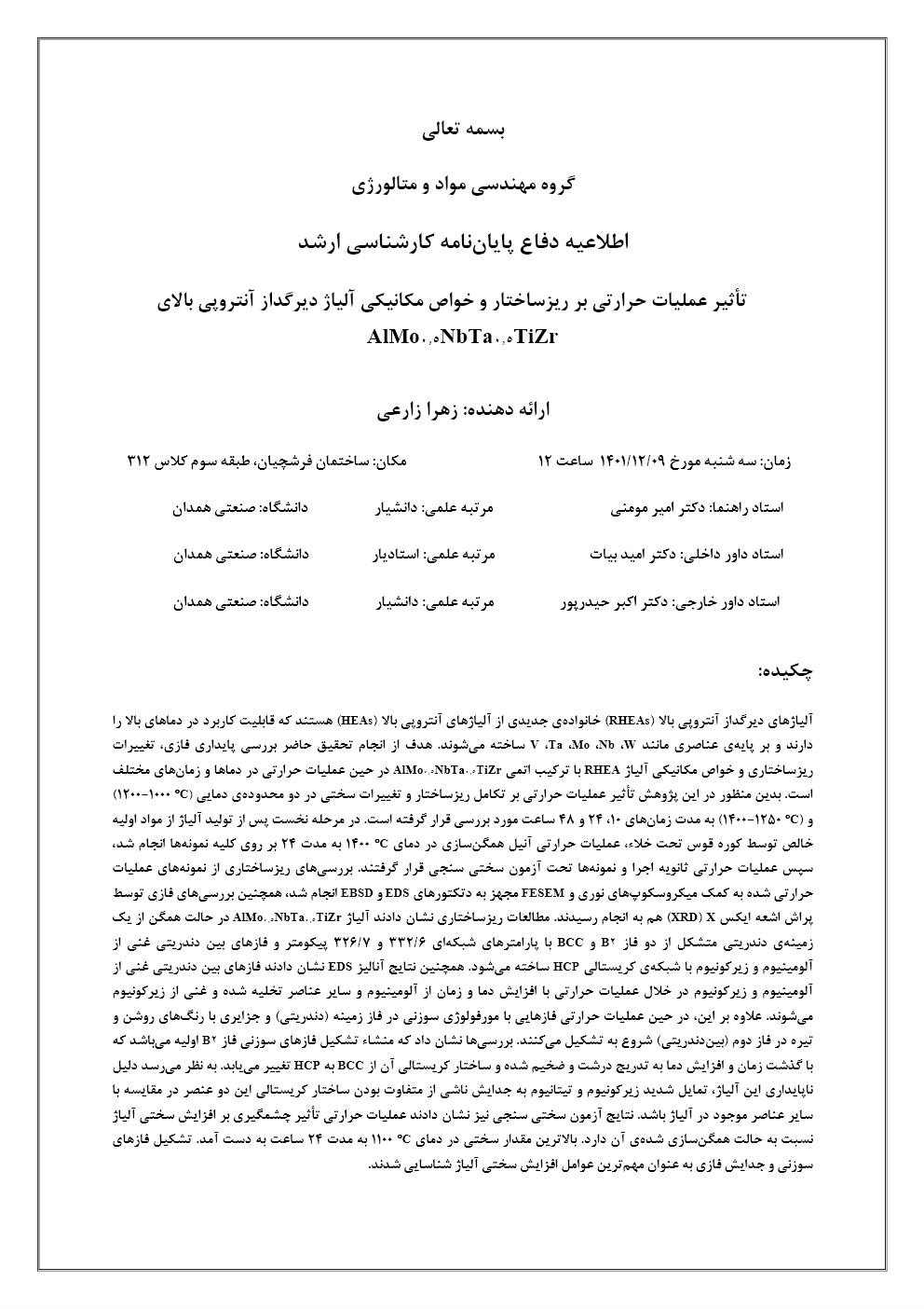 اطلاعیه دفاع دانشجوی کارشناسی ارشد - زارعی