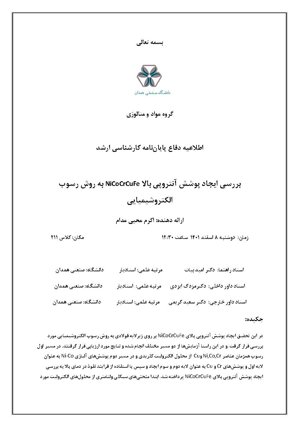اطلاعیه دفاع دانشجوی کارشناسی ارشد - اکرم محبی مدام