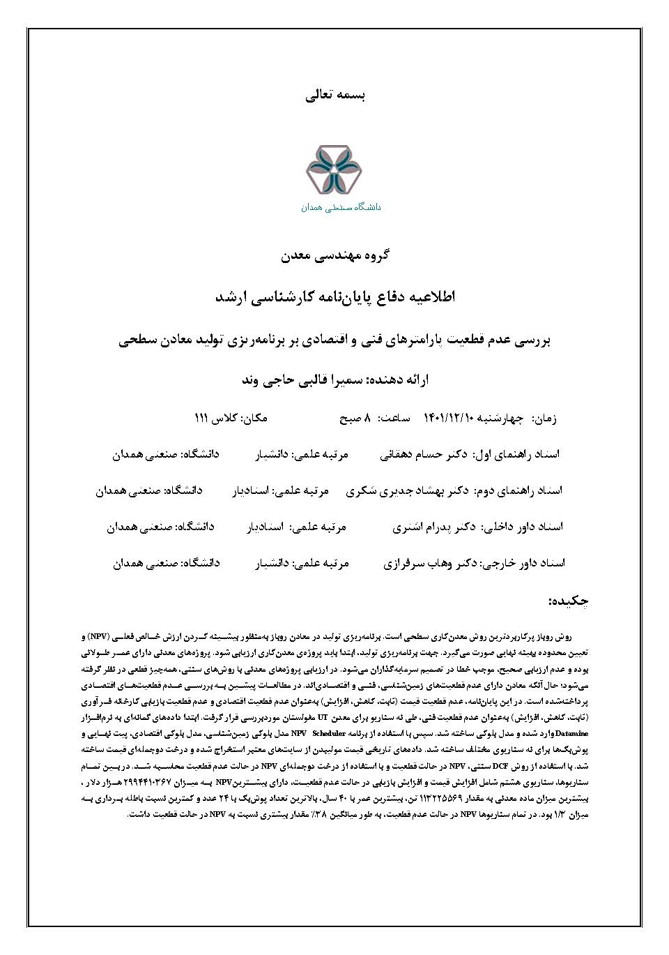 اطلاعیه دفاع دانشجوی کارشناسی ارشد - سمیرا قالبی حاجی وند