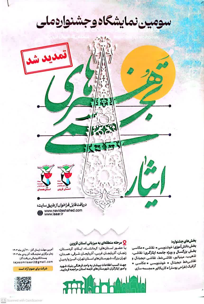 مهلت ارسال آثار به دبیرخانه سومین نمایشگاه و جشنواره ملی "هنرهای تجسمی ایثار" تمدید شد.