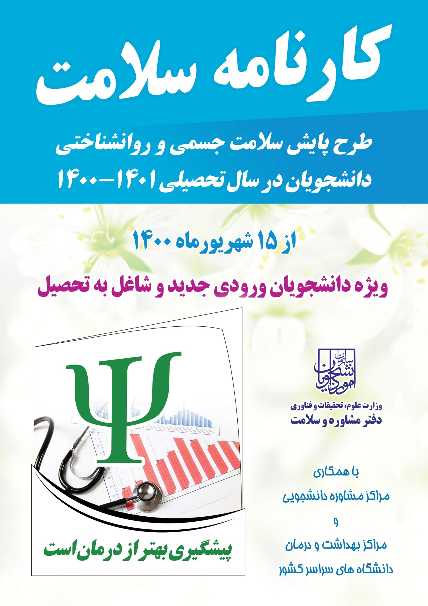دانشجویان شاغل به تحصیل از ۲۰ شهریور ۱۴۰۰ لغایت ۳۰/۰۸/۱۴۰۰ ودانشجویان جدیدالورود سال تحصیلی ۱۴۰۰ در بازه زمانی شروع ثبت نام لغایت ۳۰/۰۹/۱۴۰۰ نسبت به تکمیل نمودن کارنامه سلامت روان از “طریق سامانه سجاد ” و لینک ذیل اقدام نمایند. درصورت عدم تکمیل نمودن پرسشنامه انتخاب واحد ترم ۴۰۰۱ با مشکل مواجه خواهد شد.