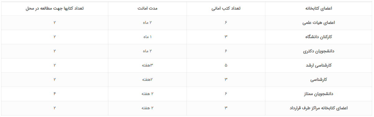 * مدت زمان مطالعه کتاب هایی که به صورت مطالعه در محل در اختیار اعضا قرار میگیرد، تا پایان ساعت کاری واحد امانت در آن روز می باشد.